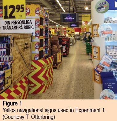 Experiment 1 investigated how store-familiar and store unfamiliar customers use in-store signs to navigate and make decisions. One hundred and one volunteer test subjects were recruited while shopping in a market that functioned as the experiment’s setting. Unbeknownst to test subjects, thirty in-store signs were installed for the experiment. Half provided navigational clues, such as advertisements or information regarding nearby goods (figure 1).