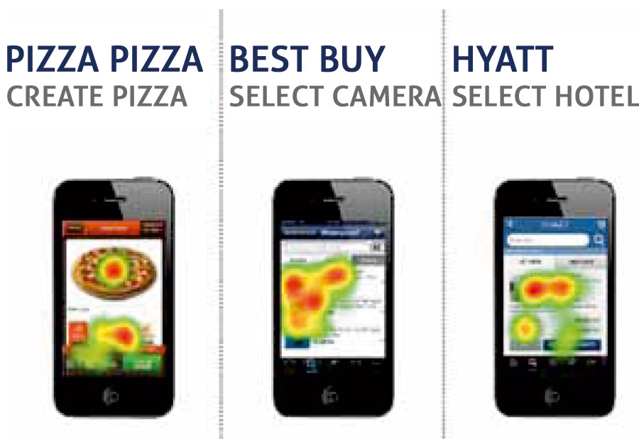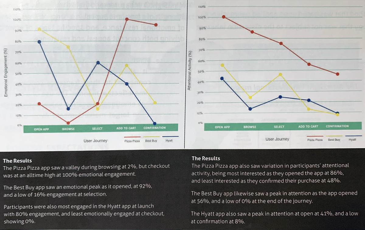 A well-crafted UX is critical to the success of a mobile application. Applying neuroscience to user testing allows us to measure the subtle layer of quality associated with a well designed UX, something not always distinguishable to the average user. By doing this we can better pinpoint the areas of a successful UX by attributing the user’s emotional response to the design. We outlined a single user journey for three transactional mobile applications to get a better understanding of how users are navigating mobile commerce. Using a portable, wireless EEG neuro-headset and eye-tracking glasses to measure the attentional and emotional activity of the user, we measured what they were looking at first, last, most and least. We measured three m-commerce applications: Pizza Pizza, Best Buy and Hyatt.