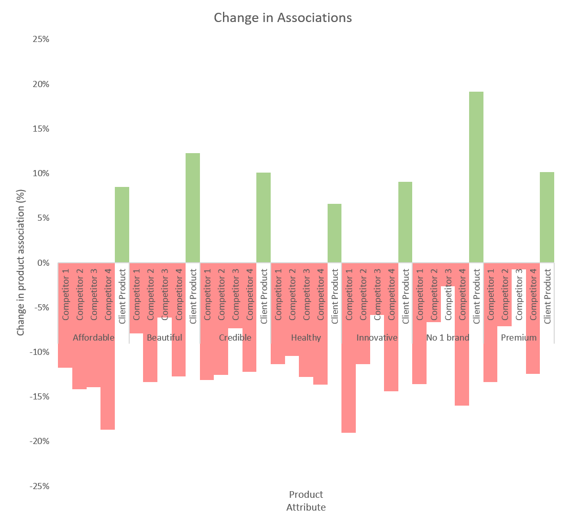 Overall positive associations for the product increased by 10%, whilst competitors on average dropped by 12%. Positive brand attributes increased across the board for the client and decreased for all competitor products.