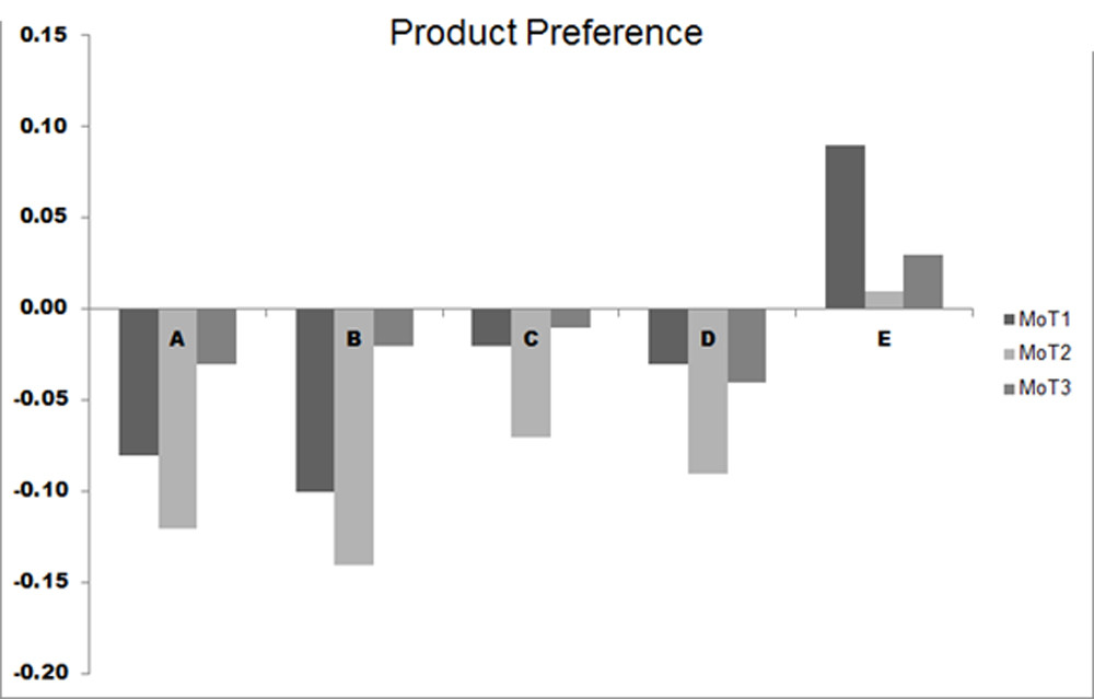 The figure below shows the liking scores, as determined by our Gen-isys program. Overall, Product E was the best liked, with a performance that was better than both Product A and Product B at the 5% significance level. While the neuroscience-based liking scores did show a modest positive correlation with explicit measures of liking, there was no statistically significant difference between the products when using explicit measures of liking. A similar pattern in neuroscience-based liking emerged when comparing the different moments of truth, although scores for the second moments of truth were generally lower across all products.