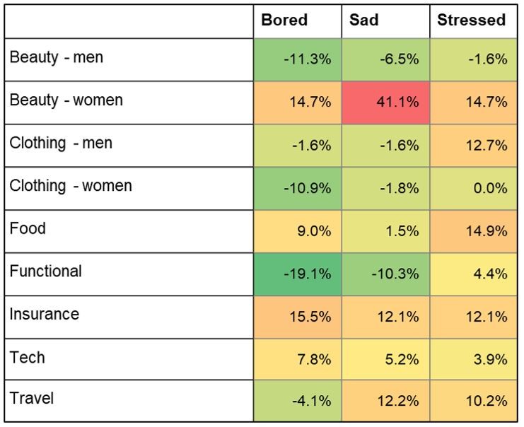 However, when they chose to buy, they were 4% more impulsive and 6% more likely to overspend. Notably, we found substantial emotionally-driven changes in spending habits when it came to beauty products. Women who were sad were over 40% more likely to overspend on beauty products (refer to figure 3). Furthermore, men who were sad displayed high impulsivity when choosing to buy beauty products. Mood also had significant effects on insurance purchases. Participants who were sad, stressed or bored were, on average, 15% more impulsive when it came to buying insurance compared with the control group.