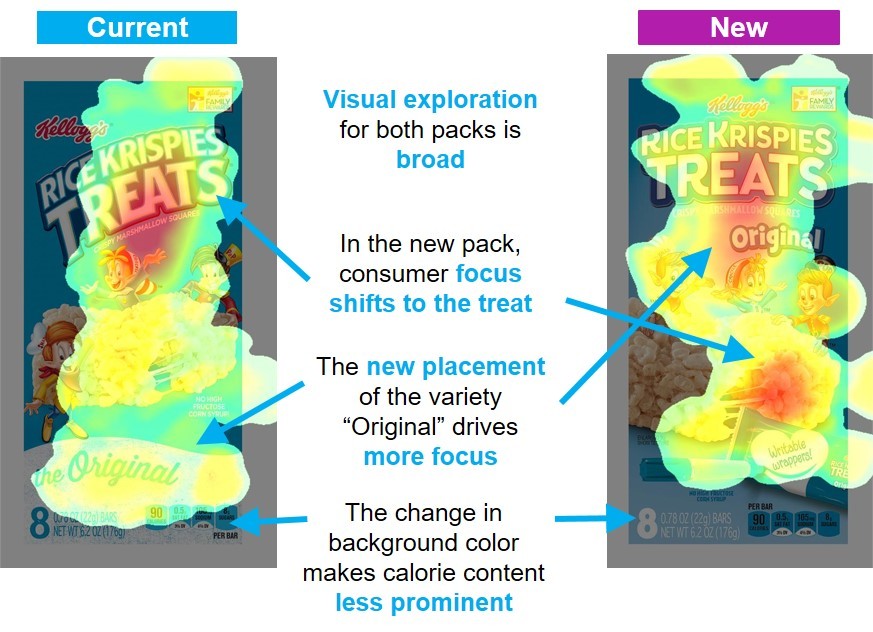 With EEG, Nielsen was able to measure critical components of consumer engagement: attention processing, memory activation, and emotional motivation. Reading EEG-based responses to the brand and to competitors, pre-exposure and post-exposure to the package allowed Nielsen to understand how well the Rice Krispies Treats new package improved activation of the brand and key messaging, as well as brand saliency after exposure in the competitive context. Using eye-tracking, Nielsen was able to identify how consumers navigate the new package and where they visually focus and, combined with EEG, provide deeper understanding of how individual and grouped elements on the package are working together.