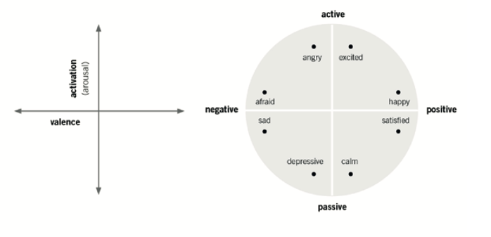 We like to try and make sense of these physiological sensations, so we construct ‘’feelings” based on the emotional response. We attribute different feelings to the same emotional response based on the specific situation we are in, our experience, personality and our cultural background. The feelings are labels we attribute to the emotion experienced (Barrett, 2017). We may frame and describe these feelings as “love”, “hate”, “jealousy”, etc., but the underlying emotion is only driven by the two dimensions of arousal and valence.
